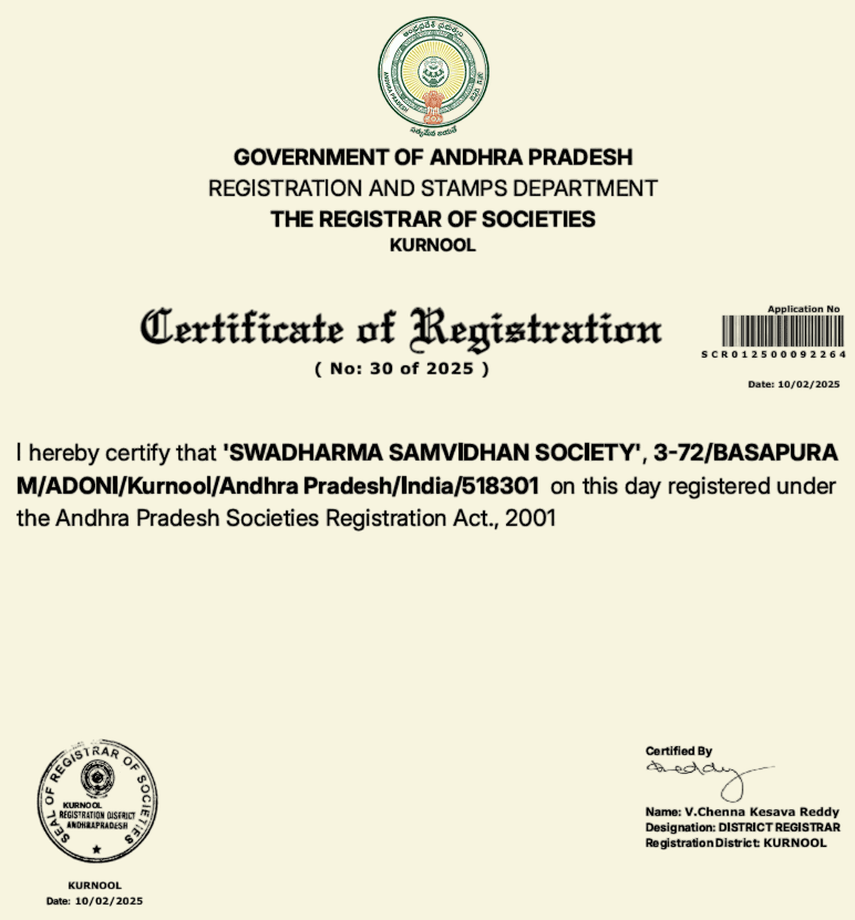 As the founder of Swadharma Samvidhan Society, I am deeply committed to empowering communities through education, healthcare, sustainable agriculture, and access to vital resources. We envision a world where every individual lives with dignity, security, and opportunity. Guided by collective responsibility, mutual support, and environmental stewardship, Swadharma Samvidhan builds a strong foundation for enduring progress that will benefit generations to come. Together, we embrace our unique purpose and work harmoniously toward a just, equitable, and sustainable future for all.